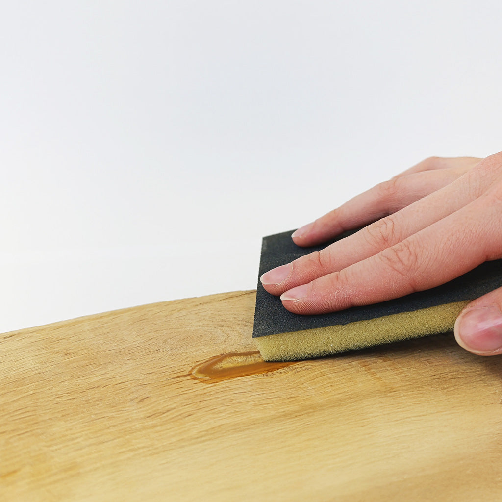 Schleife die Holzoberfläche sanft mit unseren sanding-pad an. Achte darauf immer mit der Maserung zu schleifen.